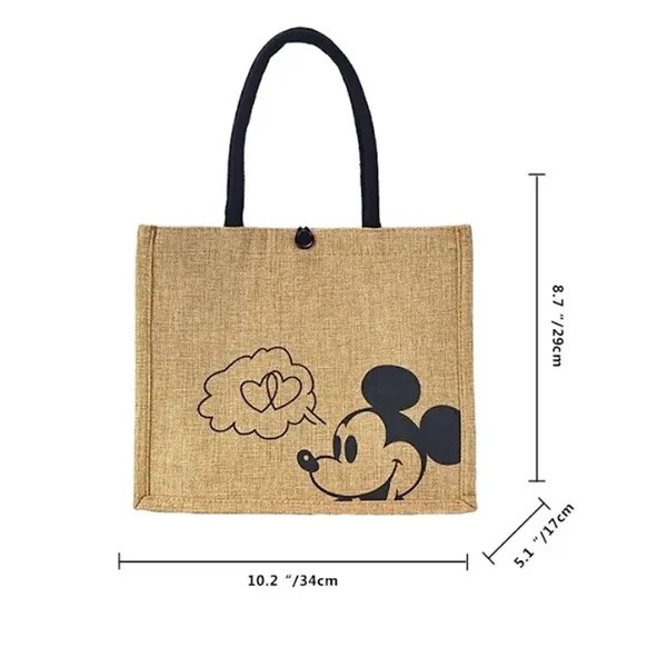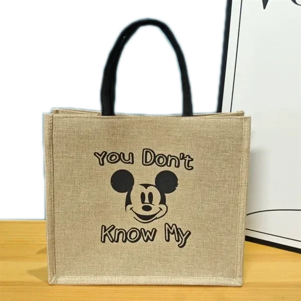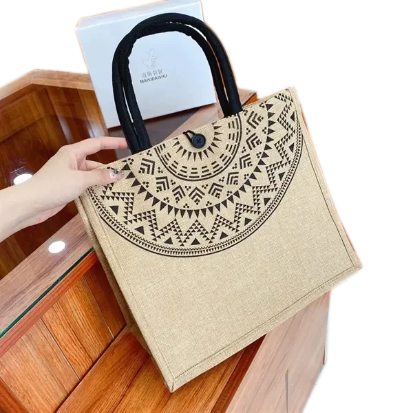 This stylish tote bag is crafted from durable jute material on the exterior and lined with smooth polyester for a sturdy and functional design. Measuring approximately 10.2″ x 8.7″ x 5.1″, it offers ample space for daily essentials or small purchases. The bag features comfortable black handles for easy carrying, and it can be fully customized with your unique designs or logos. Whether for branding, retail, or personal use, this eco-friendly tote is perfect for a variety of occasions. Ideal for giveaways, promotional events, and retail businesses, it showcases a balance of practicality and personal flair, making it a versatile accessory for all ages.