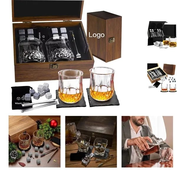 Elevate your whiskey experience with this premium whiskey gift set. The set includes a crystal-clear decanter, two intricately designed whiskey glasses, and eight reusable whiskey stones to keep your drinks cold without dilution. It also comes with tongs, coasters, and a luxury wooden box for an elegant presentation. Perfect for whiskey enthusiasts, this set combines functionality and sophistication. Made with lead-free, high-quality glassware, it ensures safe and long-lasting use. Ideal for gifting on special occasions like birthdays, anniversaries, or corporate events. Add a customized logo on the wooden box for a personalized touch or promotional branding.